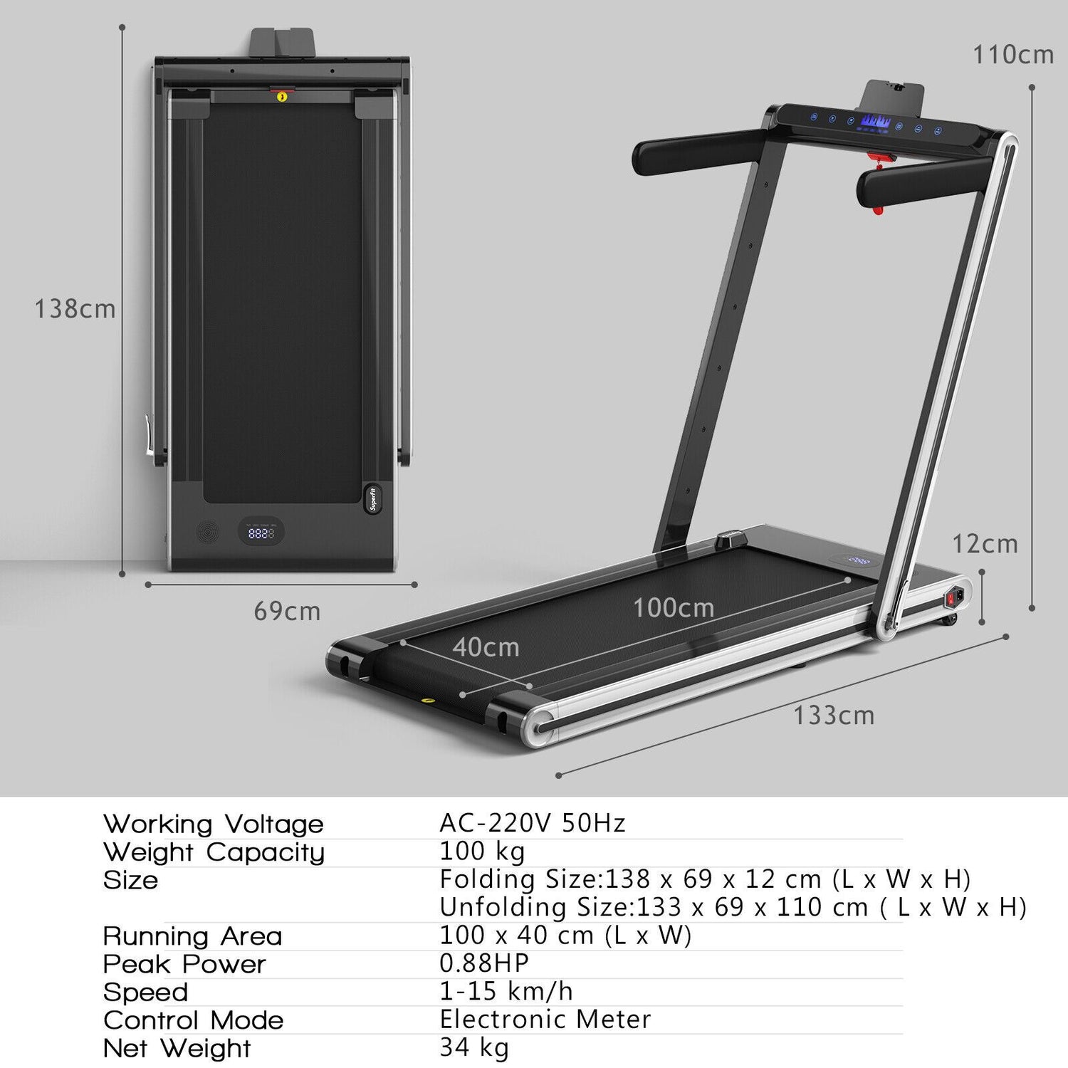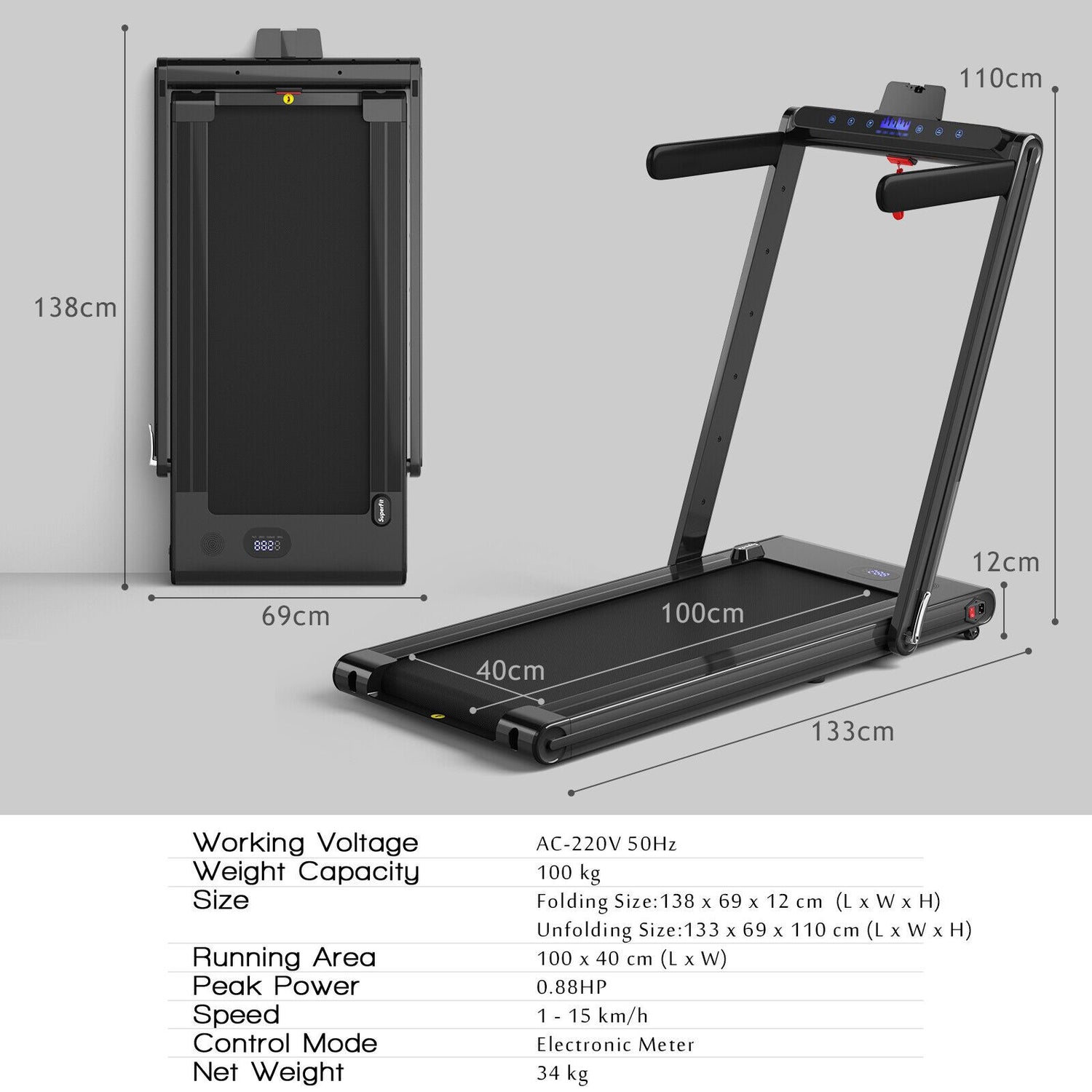 - Innovative 2-In-1 Folding Treadmill: This folding treadmill has 2 exercise modes to meet your fitness requirements. The speed of running motion is 1-15km/h. You can also use it under the desk at a speed of 1-4 km/h, which is convenient for you to exercise while working at home or office.