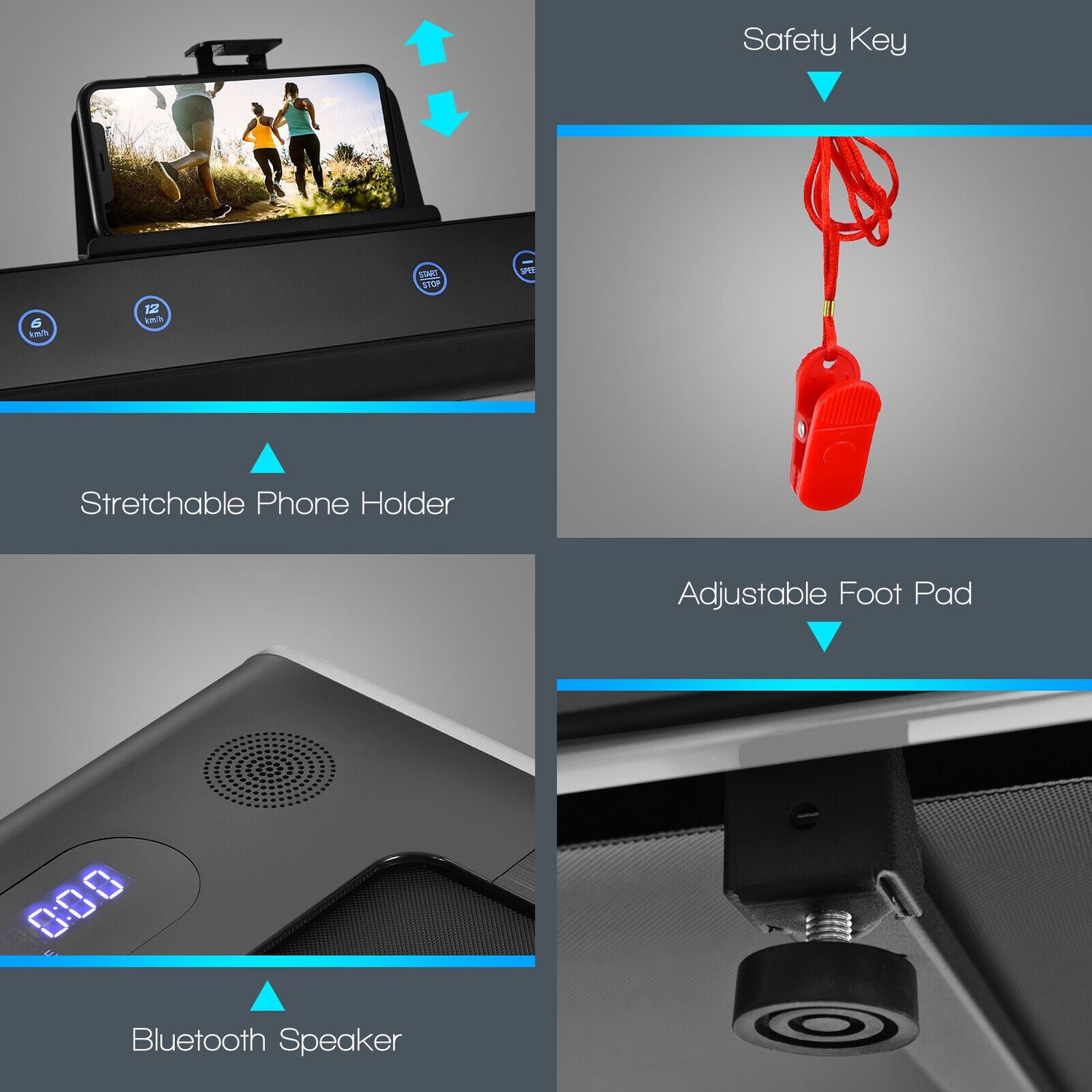 This electric treadmill with remote control provides 2 modes for your selection. One is walking motion (1-15 km/h) and another is running motion (1-4km/h). Meanwhile, there is an LED touch screen on the top and an LED display window at the bottom. Therefore, you are able to walk or run conveniently. Besides, the 5-layer anti-slip running belt and 0.88HP powerful motor make this running machine safe and noiseless. What’s more, you can connect to the Gymax APP via Bluetooth to explore different functions. Likewise, the phone holder and Bluetooth speaker bring more interest while training. After exercising, you can fold the treadmill into a compact size and move it easily with 2 built-in wheels.